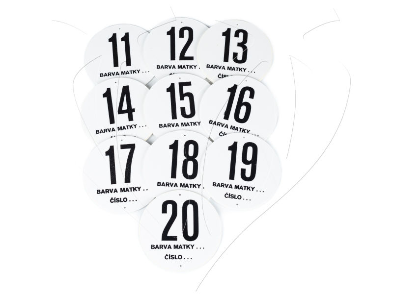 Kulatá čísla z odolné umělé hmoty představují jednoduchý způsob, jak přehledně označit úly na včelnici. Kromě pořadového čísla mohou sloužit i k rozlišení dalších údajů, například k barevnému označení ročníku matky.